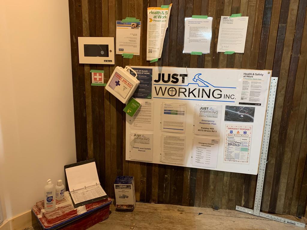 Jess mulled over how to fulfill WSIB’s mandates for smaller sites, such as residential renovations. There was often no place for a bulletin board, especially in someone’s living space. How would they make critical health and safety information easily accessible? Where would the eye wash station be? How about the first aid kit? How could workers quickly find the fire extinguisher or emergency phone numbers at each location?